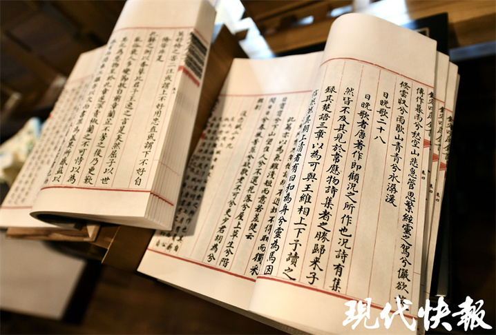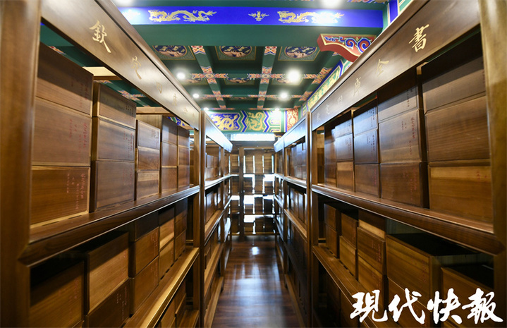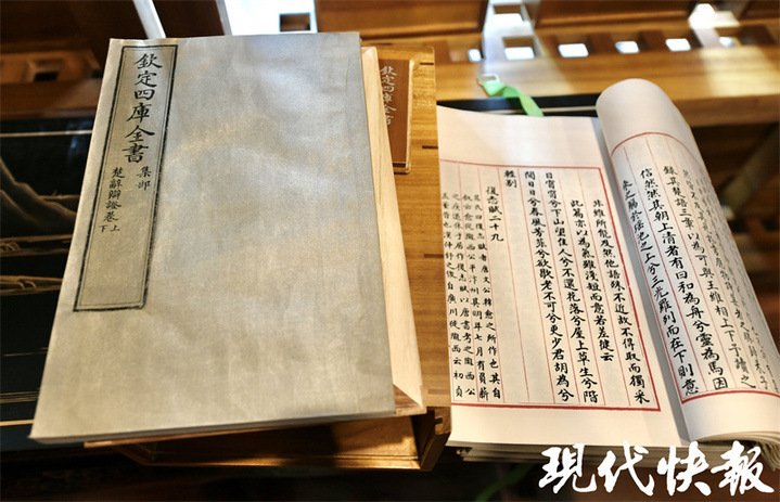 在文汇阁三楼,一排排金丝楠木制成的书架散发木香,盒函分经史子集四大类摆放。其中一个盒函可供市民游客打开观赏,这是一部集部《楚辞集注》,打开盒函,还有两片香樟木夹着书籍,保障书籍不蛀不皱。灰色绢布装帧低调典雅,透露着这部书的不凡身世。扬州国旅文汇阁管理部经理邵媛介绍:“这部书是文津阁的复制本,书中字体也是馆阁体,采用了筒子页的装帧方式,大小、颜色、样貌都和古书一模一样。”据了解,文汇阁始建于1780年,1854年文汇阁及其藏书毁于战火。今年文汇阁复建完成并正式开放,《四库全书》重新入藏,时隔169年书与阁再次相逢。