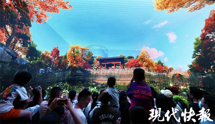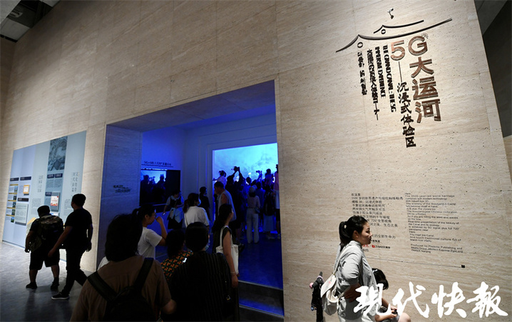现代快报记者注意到,中运博里人气爆棚,全国各地的游客汇聚于此。其中人气最高的,当属由凤凰出版传媒集团现代快报策划制作的“5G大运河”沉浸式体验馆。