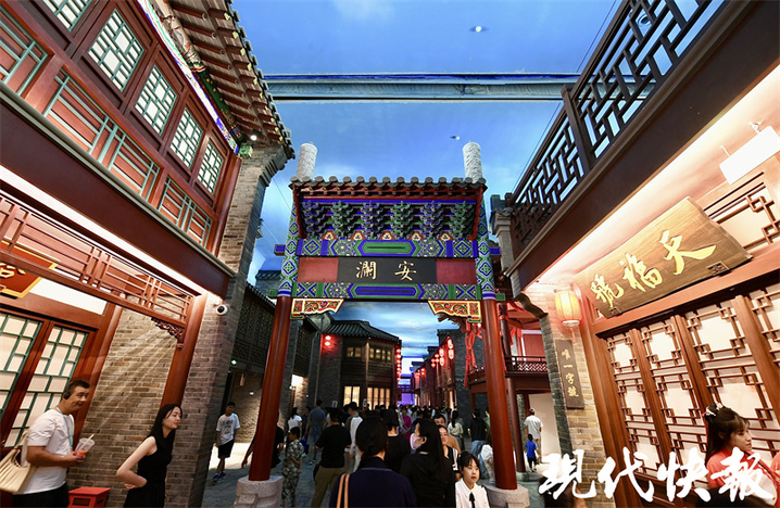 青石板街肆两旁,古色古香的建筑上悬着灯笼幡旗,头顶的LED天幕光影变幻……踏入“大运河街肆印象”展厅,时空穿越的感觉扑面而来,从隋唐到明清,从江南到北京,运河街景复现在人们眼前。