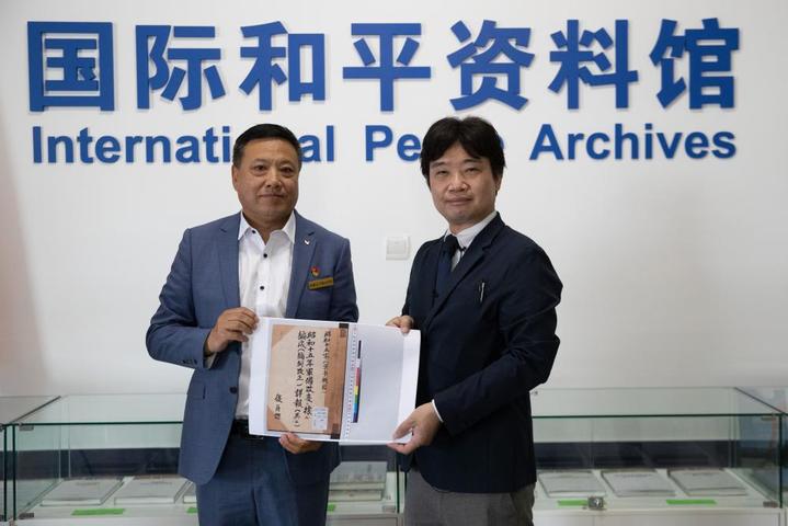 6月1日,日本学者松野诚也(右)将侵华日军第七三一部队职员表影印资料赠予黑龙江外国语学院国际和平资料馆。(新华社记者张涛摄)
