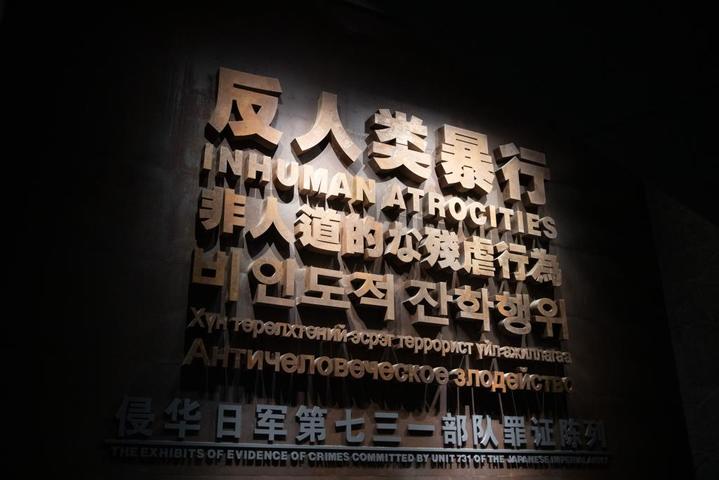 这是黑龙江省哈尔滨市侵华日军第七三一部队罪证陈列馆内用六种语言写的“反人类暴行”墙(新华社记者张涛2022年12月10日摄)。