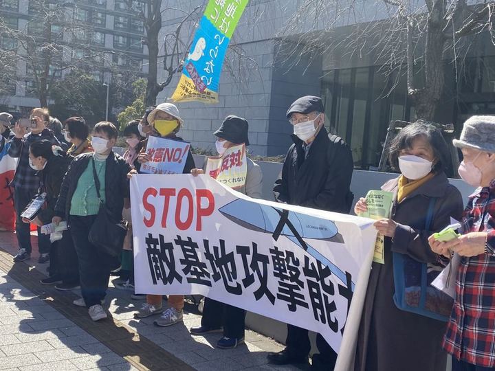 2月28日,在日本东京,日本民众举着标语牌抗议日本众议院通过高额的防卫费预算案。新华社记者郭丹摄