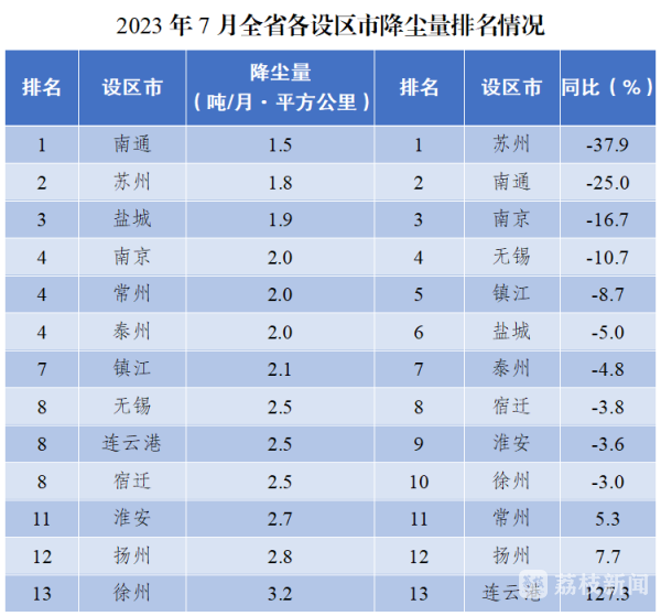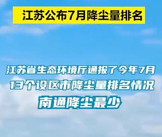 今天(8月21日),江苏省生态环境厅向社会通报了今年7月,13个设区市降尘量排名情况。