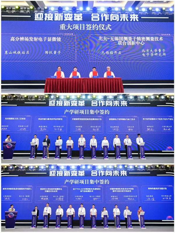 活动现场,北大—无锡国测量子精密测量技术联合创新中心、高分辨场发射电子显微镜等重大项目,球形多智能体协进化辅助医疗机器人、特种传感光纤光缆开发、新能源电子材料制备与加工技术等15个产学研合作项目集中签约。