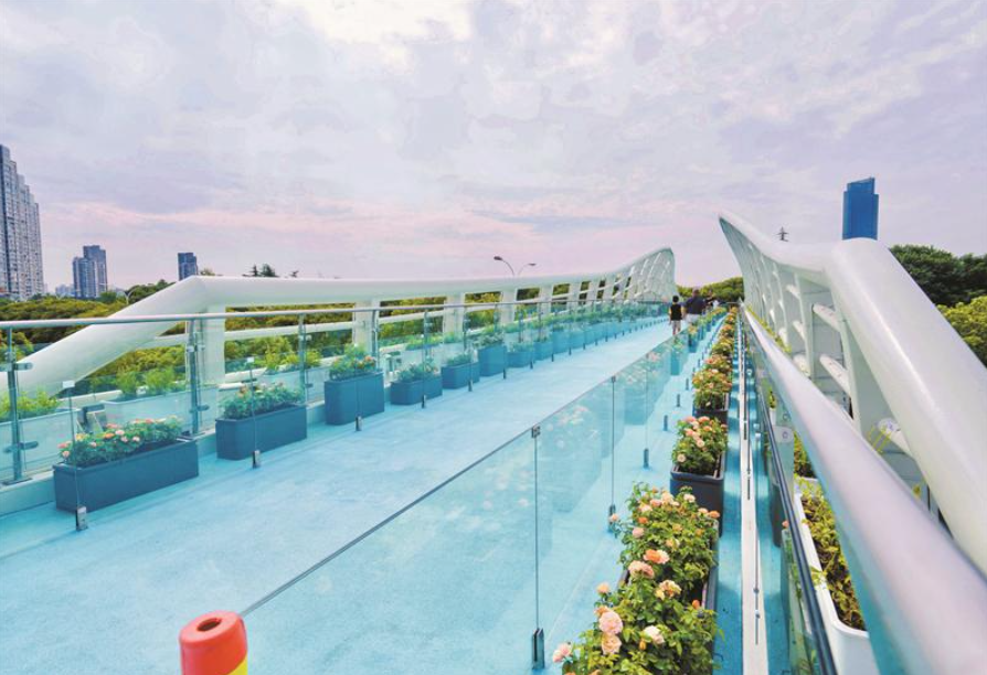 值得一提的是,东蠡湖人行天桥不仅有高颜值,更有一系列“高科技”。从滨湖区建管中心了解到,这座人行天桥全桥采用钢箱梁结构,主桥长度60.8米,桥面宽度5米,净高5.2米,是无锡首个引入“消冰防冻”系统的人行天桥。在桥面及梯道设计中,通过物联网实现智能化管理,天气变化可以被“尽收眼底”,一旦达到设置条件,天桥内置的发热系统就会自动进入工作状态,发热融化路面积雪,这可以有效改善冬季桥面通行条件,保障行人出行安全。同时,桥梁采用的语音提示系统也为行人通行的舒适性和安全性再加码。