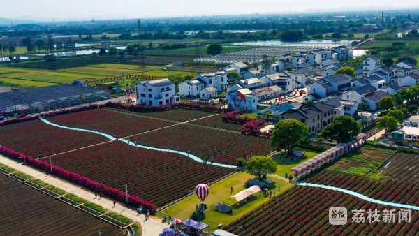 在宜兴徐舍镇美栖村,田地里的玫瑰迎风摇曳,有些玫瑰花已经盛开,有些含苞待放。从远处望去,可以看到喷淋的工具不断洒水,玫瑰花也更加娇艳欲滴。
