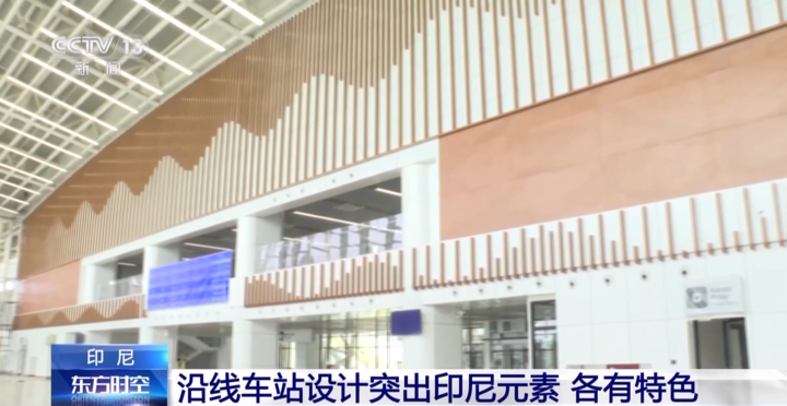 总台记者 唐鑫:离开雅加达的哈利姆火车站,雅万高铁向东来到了全线的第二站,卡拉旺火车站。这座车站临近附近的工业园区,因此车站的设计理念也正源自卡拉旺由传统农业粮仓转型为现代新型工业小镇的发展变迁。卡拉旺车站站房建筑立面采用连续的“Y”字型支架,象征传统粮仓的样子;玻璃幕墙外侧应用简洁的格栅系统、大面积钢结构和无吊顶体系,象征现代工业的力量与质感,整个车站的设计体现着农耕文明与工业文明的共生和发展。