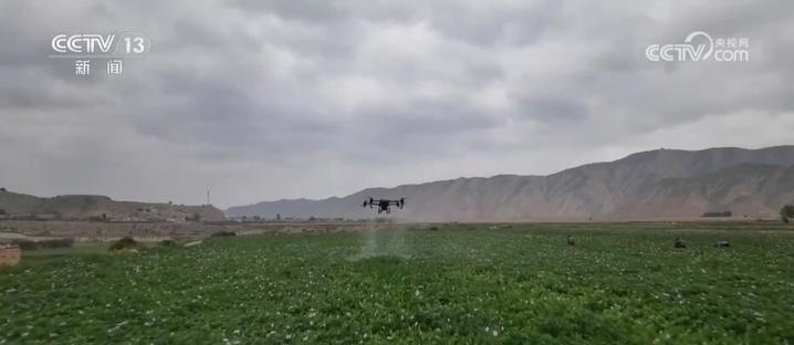 在定西市安定区鲁家沟镇的马铃薯种植基地里,无人机和自走式喷杆喷雾机全部上阵,进行“一喷多促”作业,通过喷施叶面肥、营养液,实现马铃薯块茎加速生长,促进单产提升等功效。