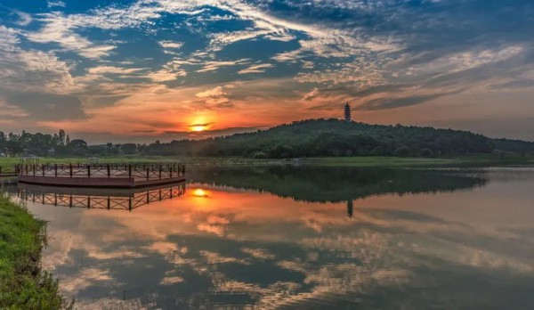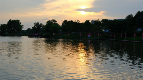夕阳倒映在垂钓基地的水面