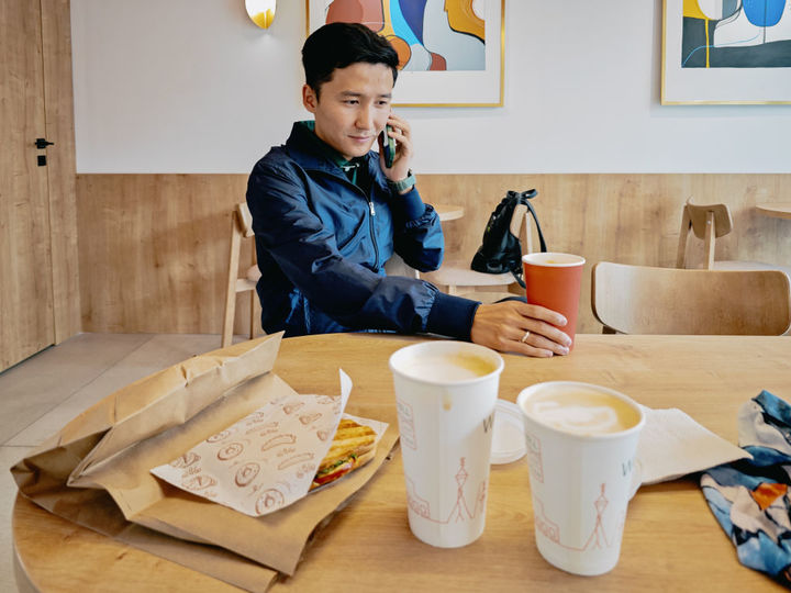 奥伦巴萨尔在咖啡馆打电话。(记者供图)