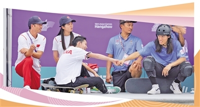 9月25日,泰国代表团选手(前右)向获得滑板项目男子碗池冠军的中国代表团选手陈烨(前左)表示祝贺。