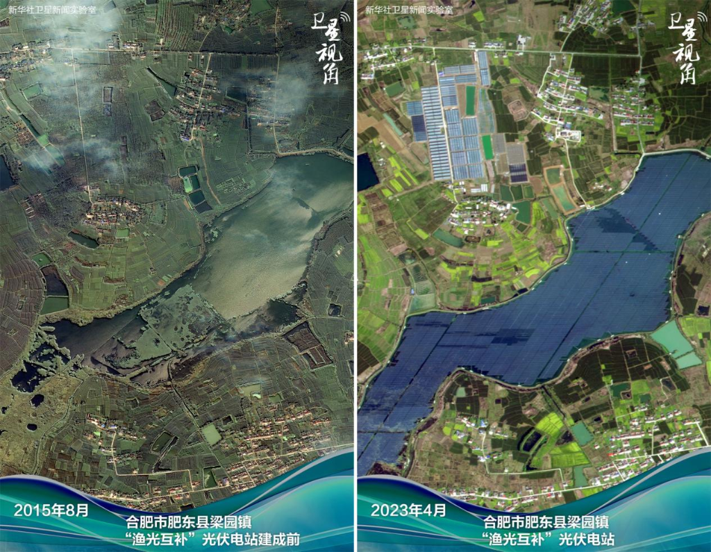 ↑2023年与2015年对比,“渔光互补”光伏电站在梁园镇陷陂湖铺成一片蔚蓝。