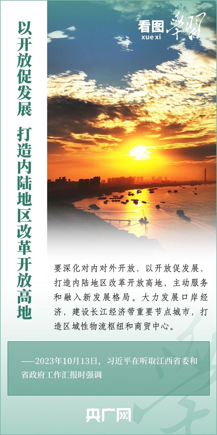10月10日至13日,习近平总书记在江西九江、景德镇、上饶等地,深入长江岸线、企业、历史文化街区、农村等进行调研。总书记强调,江西要着眼高质量发展、绿色发展、低碳发展等新要求,解放思想、开拓进取,扬长补短、固本兴新,努力在加快革命老区高质量发展上走在前、在推动中部地区崛起上勇争先、在推进长江经济带发展上善作为,奋力谱写中国式现代化江西篇章。一起来学习!