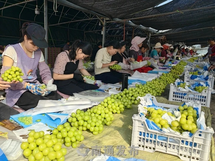 “今年葡萄大丰收,虽然价格比往年低,但来采摘的人更多了。”葡萄是新义村的“关键词”。沿着彩虹大道从启东市合作镇新义村村部步行前往十里阳光葡萄园,一路上都是葡萄大棚。长廊下,满载葡萄的电动三轮车、坐在摊位前包装的工人、等待装货的货车……一幅喜人的丰收画跃入眼帘。种植大户魏宏产正忙着将新鲜采摘的葡萄运到包装点,这些葡萄将在当天发往上海。