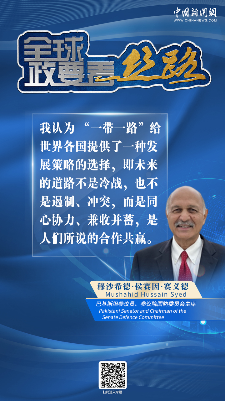 中新网10月28日电(张乃月) “‘一带一路’给世界各国提供了一种发展策略的选择,即未来的道路不是冷战,也不是遏制、冲突,而是同心协力、兼收并蓄,是人们所说的合作共赢。”巴基斯坦参议员、参议院国防委员会主席穆沙希德·侯赛因·赛义德近日接受中新网专访时如是说。