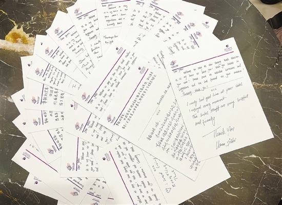 这样有爱的故事几乎每天都在发生。拾到钱包后完璧归赵、为客人准备药物和眼罩缓解眼睛疲劳……为了接待远道而来的客人,酒店在每个房间里准备了特色伴手礼、欢迎水果和留言卡片等。“很多客人都是第一次来杭州,希望能让他们在杭州有宾至如归的感觉。我们设置留言卡是为了让客人们提出自己的需求或者对我们的服务提出改进意见。”方明说,没想到留言卡变成了感谢信,先行离开的客人在房间里留下了30多封写在留言卡上的感谢信,为酒店的贴心服务点赞。