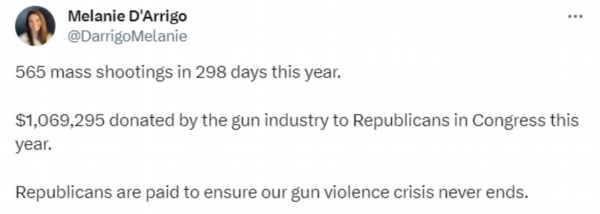 更有网友讽刺称,面对着今年298天内的565场大规模枪击事件,美国共和党选择拿着枪支行业的钱,来确保美国的枪支暴力绝不结束。