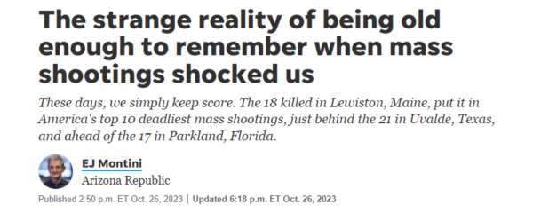 《今日美国报》(USA Today)网站刊登EJ Montini的文章称,美国缅因州刘易斯顿市25日发生的枪击案以18人死亡的悲惨程度 “入选”美国十大最致命的大规模枪击事件,死亡人数仅次于得克萨斯州乌瓦尔德的21人,高于佛罗里达州帕克兰的17人。而且在缅因州枪击案中,仍有伤者处于危机状态,生死未卜。