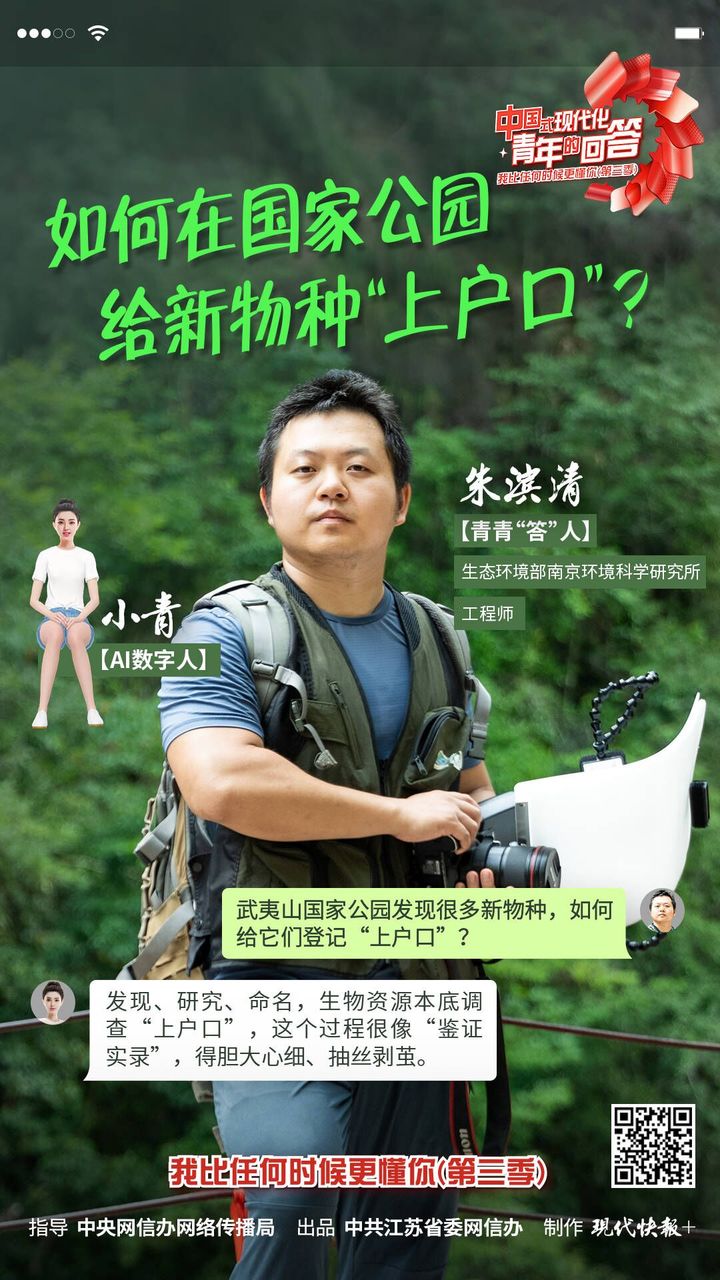 10月29日,“中国式现代化·青年的回答——我比任何时候更懂你(第三季)”系列短视频之《如何在国家公园给新物种“上户口”?》正式上线。本集视频中,青青“答”人——生态环境部南京环境科学研究所工程师朱滨清和AI数字人小青,带领大家驰骋于武夷秘境,探秘如何在国家公园给新物种“上户口”。