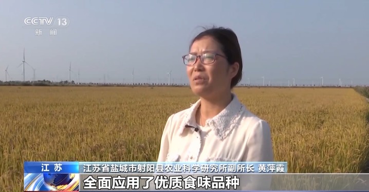 江苏省盐城市射阳县农业科学研究所副所长 黄萍霞:全面应用了优质食味品种,同时全部采用水稻毯式播苗机插高产栽培技术,配合绿色循环种养、病虫害综合防治这些技术,获得了今年的高产。