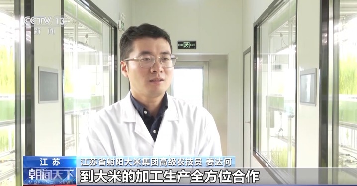 江苏省射阳大米集团高级农技员 姜达何:我们和江苏省农科院合作成立了江苏射阳大米产业研究院和博士工作站,从种子的研发到大米的加工生产全方位合作,目前已有近150个品种试验示范,水稻良种覆盖率达90%。