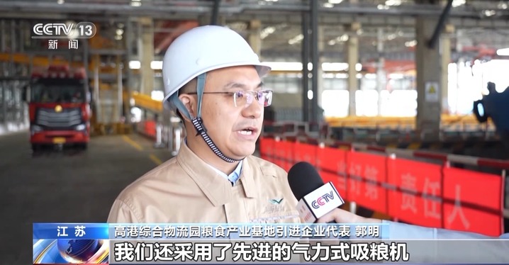 高港综合物流园粮食产业基地引进企业代表 郭明:我们是长江沿线唯一一个挖入式码头,除了可以365天全天候无间断作业之外,我们还采用了先进的气力式吸粮机,它全程在管道内封闭作业,做到节粮减损。
