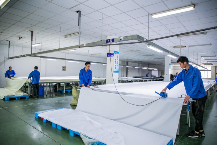10月19日下午,在通州区金新街道南通华勤纺织装饰有限公司车间里,工人正在加紧生产欧美客户的订单。