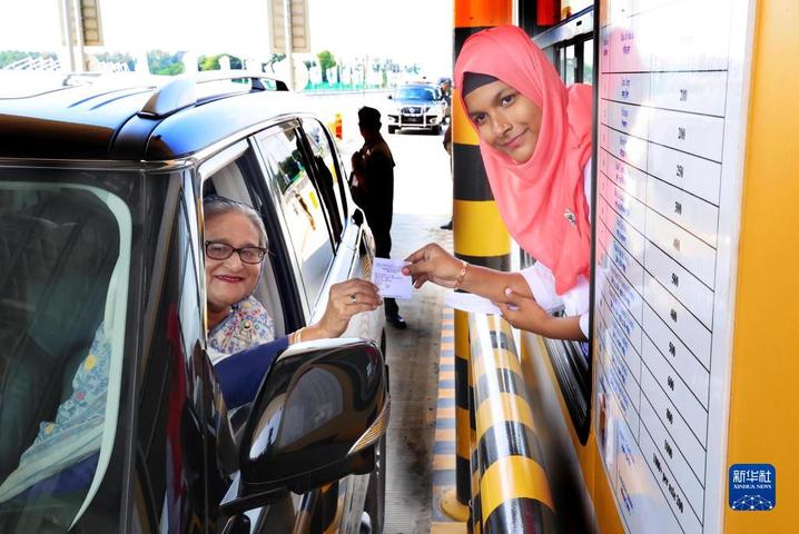 10月28日,在孟加拉国吉大港市,孟加拉国总理哈西娜通过卡纳普里河底隧道收费站时缴费。新华社发