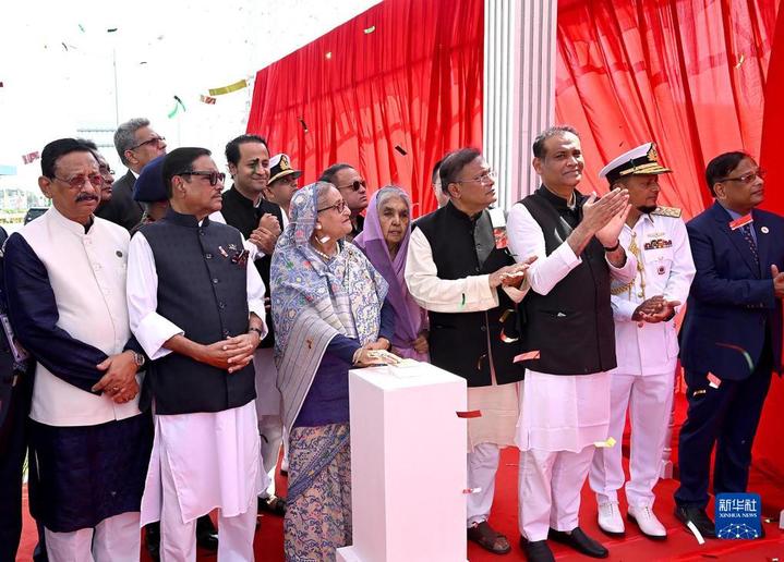 10月28日,在孟加拉国吉大港市,孟加拉国总理哈西娜(前排左三)出席卡纳普里河底隧道通车仪式。新华社发