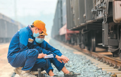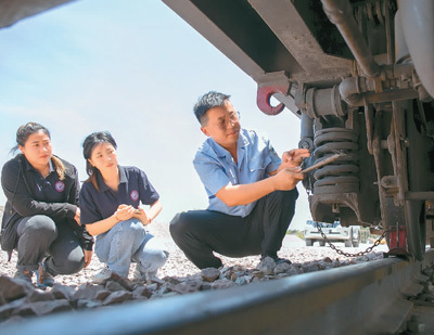在老挝首都万象北郊的中国中铁二局中老铁路铺轨基地,老挝姑娘希达·平蓬莎万(中)跟着中国师傅(右)检查列车。 |