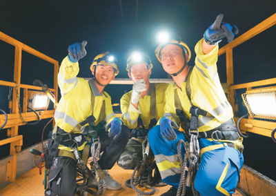 中国师傅潘贵(右)带领老挝徒弟冯图(左)以及冯图的徒弟康更(中)一同登乘轨道车作业。 |