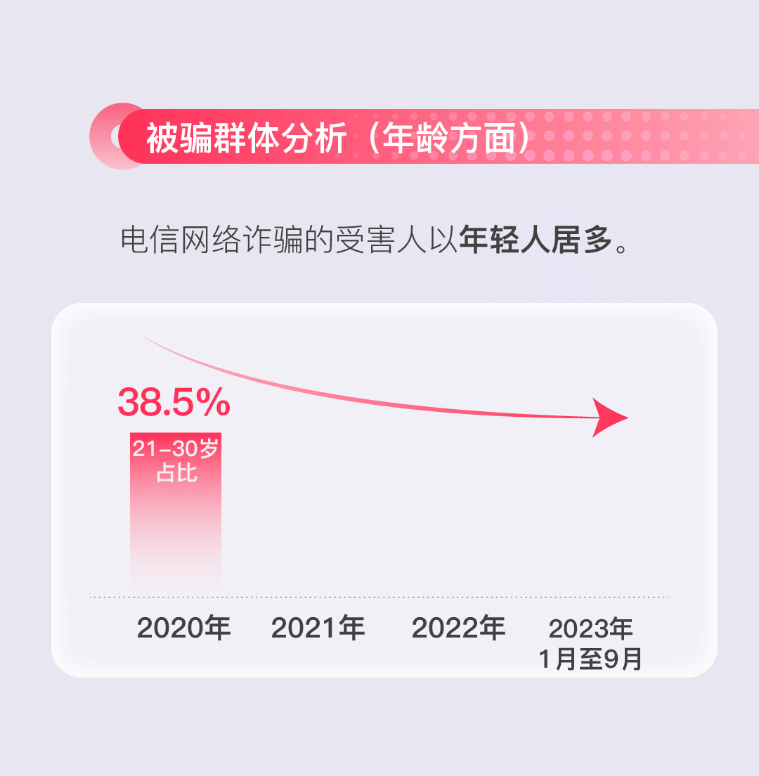 2023年1月至9月,年龄方面,案件高发年龄段前三名分别为:31至40岁占比29.1%。21至30岁占比28.8%。41至50岁占比21.1%,由此可见,电信网络诈骗的受害人还是以年轻人居多。性别方面,男性受害人占比52.5%。女性受害人占比47.5%,男性略多于女性。职业方面,企业、工厂职工被骗占比56.4%。待业被骗占比14.0%。个体户被骗占比7.4%。