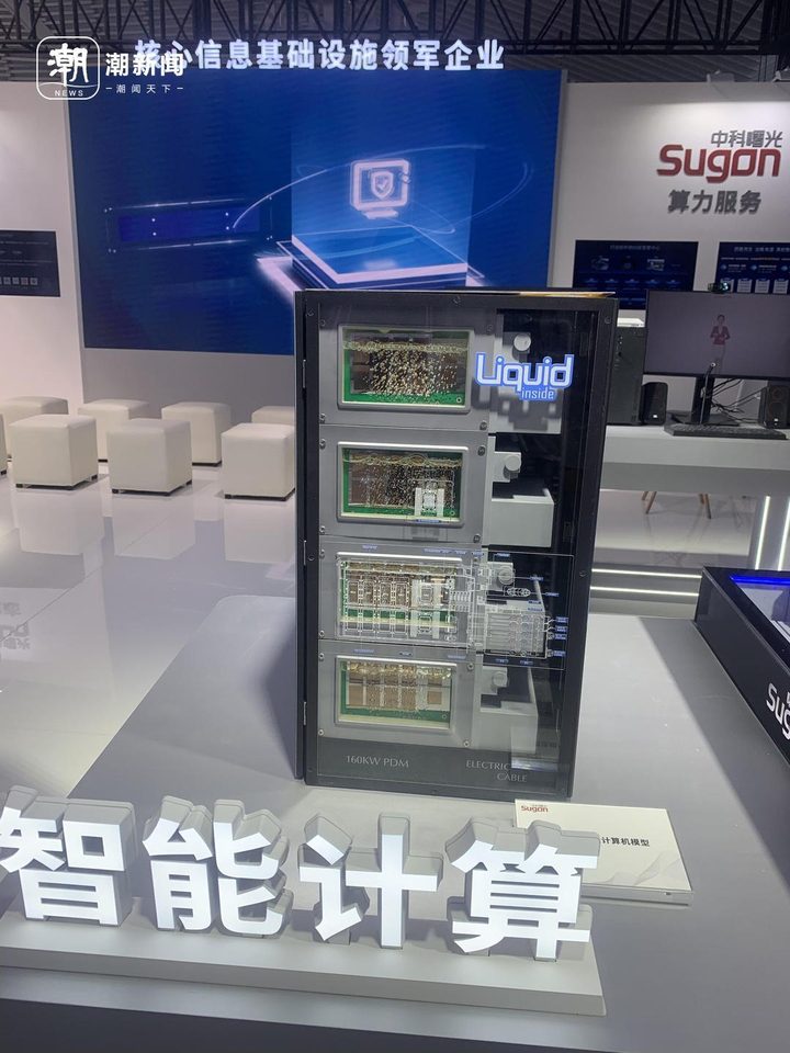 与传统数据中心风冷模式不同,这款计算机的散热是通过特殊处理的液体进行的。透过主机外围的玻璃可以看到,计算机核心部件“浸泡”在特殊液体中,其运行过程中产生的热量通过气化的液体被高效带走,进而达到降温目标。曙光浸没液冷技术,能大幅降低数据中心用于散热的能耗。目前采用曙光液冷技术的多地数据中心,已节电超4亿度,相当于减少了1.35万吨以上二氧化碳排放。