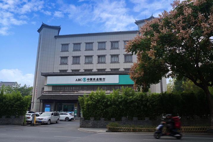 在乌镇子夜路和新华南路的东南角,一人高的围墙后就是农行乌镇支行所在的小院。正门和侧门都是伸出的飞檐和藏在屋檐里的柱头,仿的是明清的木雕风格,雕的是和合二仙。主体建筑的楼梯间外,也是一列木制花格窗框。