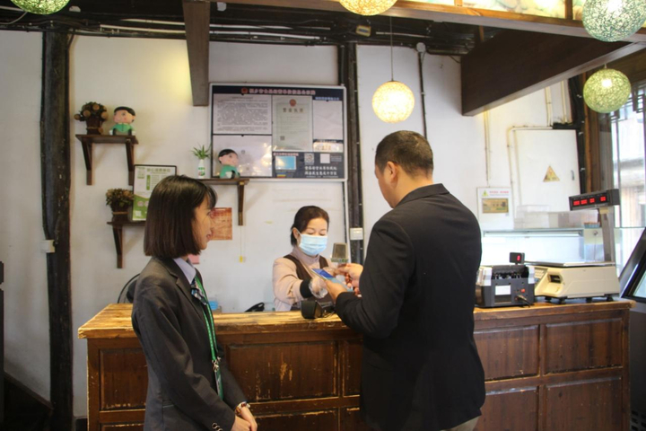 每次来到王金的店里,他们都会跟他多聊一会儿。王金是西栅景区的第一批商家,在景区里开着一间小饭店。每次农行来人,王金总是笑呵呵地问,有没有新机器可以装的?有新机器,他都是第一个“尝鲜”试用的人。