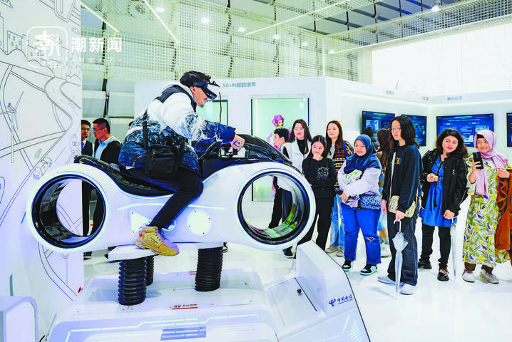 11月9日,在2023年“互联网之光”博览会上,参观者在体验5G+VR摩托车。 潮新闻记者 姚颖康 摄