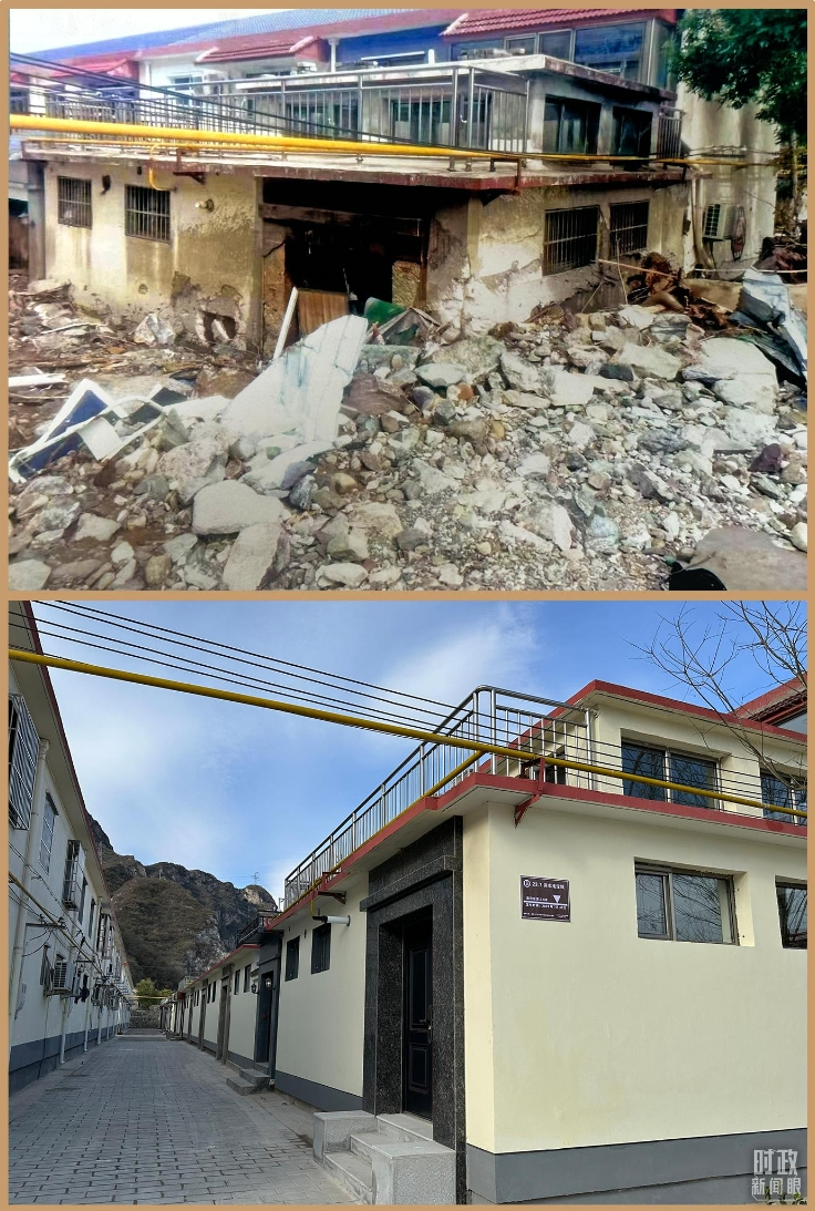 △ 村民房屋遭遇洪灾与灾后重建的对比图。(总台央视记者范一鸣拍摄)