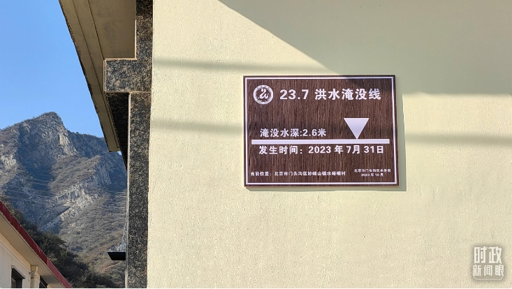 △ 村民房屋外设立了洪水淹没线的标牌。(总台央视记者贾林拍摄)