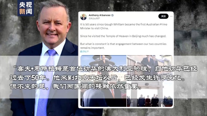 澳大利亚总理 安东尼·阿尔巴尼斯:今年是惠特拉姆总理访华50周年纪念,那是澳大利亚与中华人民共和国建交后澳大利亚总理首次访华。