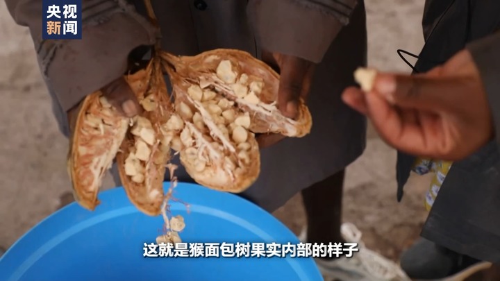 进博会参展商 奈莉:我们在这里将果实切开,首先查看果实的质量,里面是否有虫蛀。你甚至可以直接吃,酸甜味,就跟糖果一样。这就是猴面包树果实内部的样子。