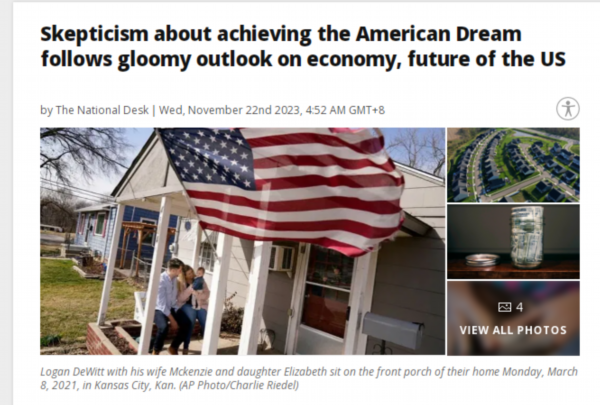 中国日报网22日电 (党超峰)美国辛克莱广播集团旗下新闻网站“thenationaldesk”22日报道,过去两年,美国人不但饱受通货膨胀之苦,还担心经济陷入衰退。许多人对经济前景和自己的未来持悲观态度,对"美国梦 "心存疑虑。
