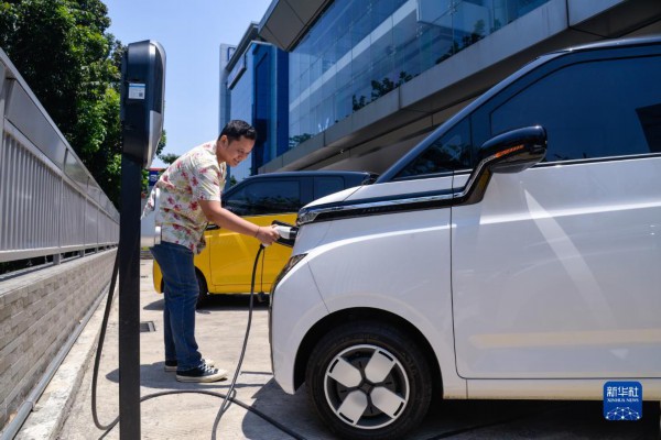 9月29日,在印度尼西亚雅加达五菱中心4S店停车场,一位车主在为自己的五菱新能源车Air ev充电。新华社记者 徐钦 摄