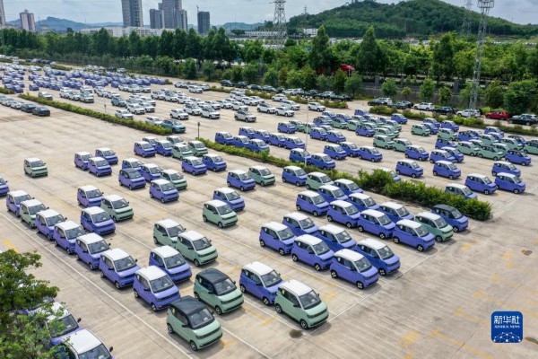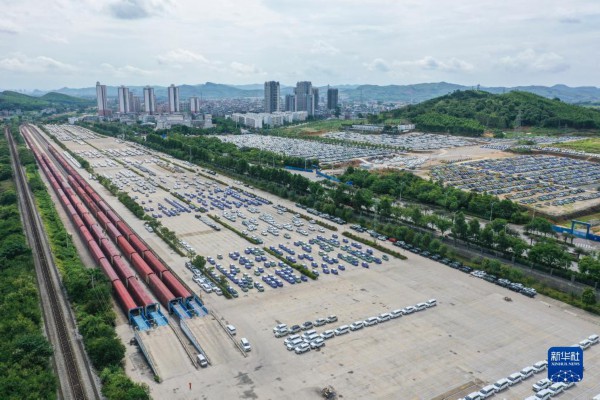 这是位于广西柳州市的雒容汽车物流基地,一些出口的新能源汽车从这里装车运往各大出海港口(7月19日摄,无人机照片)。新华社记者 曹祎铭 摄