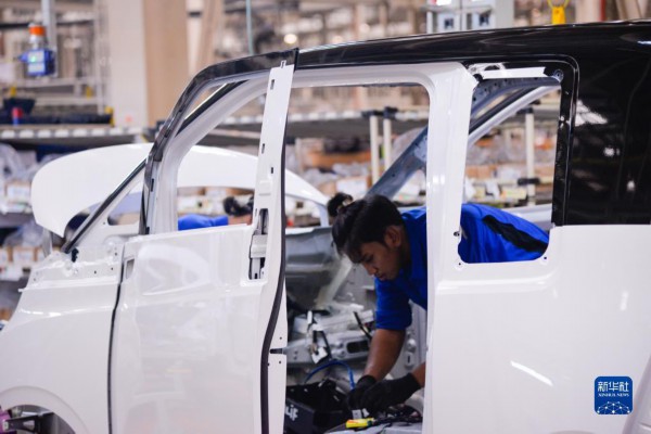 2月24日,在印度尼西亚勿加泗,工人在上汽通用五菱印尼汽车有限公司工厂的生产线上作业。新华社记者 徐钦 摄