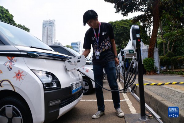 9月6日,在印度尼西亚雅加达第43届东盟峰会五菱汽车服务站,工作人员为一辆五菱新能源车Air ev充电。新华社记者 徐钦 摄