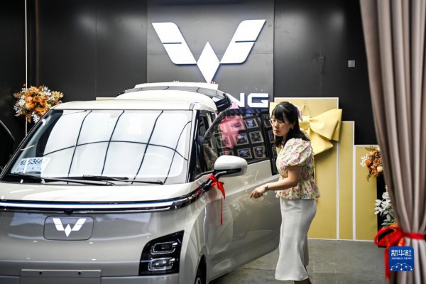 在广西柳州市一家新能源汽车销售店内,一位车主提验新车(7月20日摄)。新华社记者 曹祎铭 摄