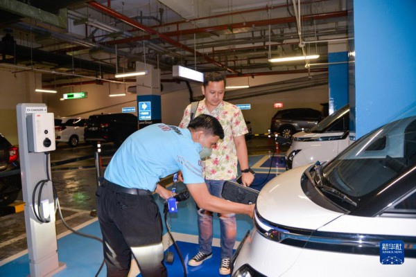 9月29日,在印度尼西亚雅加达一家商场的地下停车场,工作人员为一位五菱新能源车Air ev车主结束充电。新华社记者 徐钦 摄