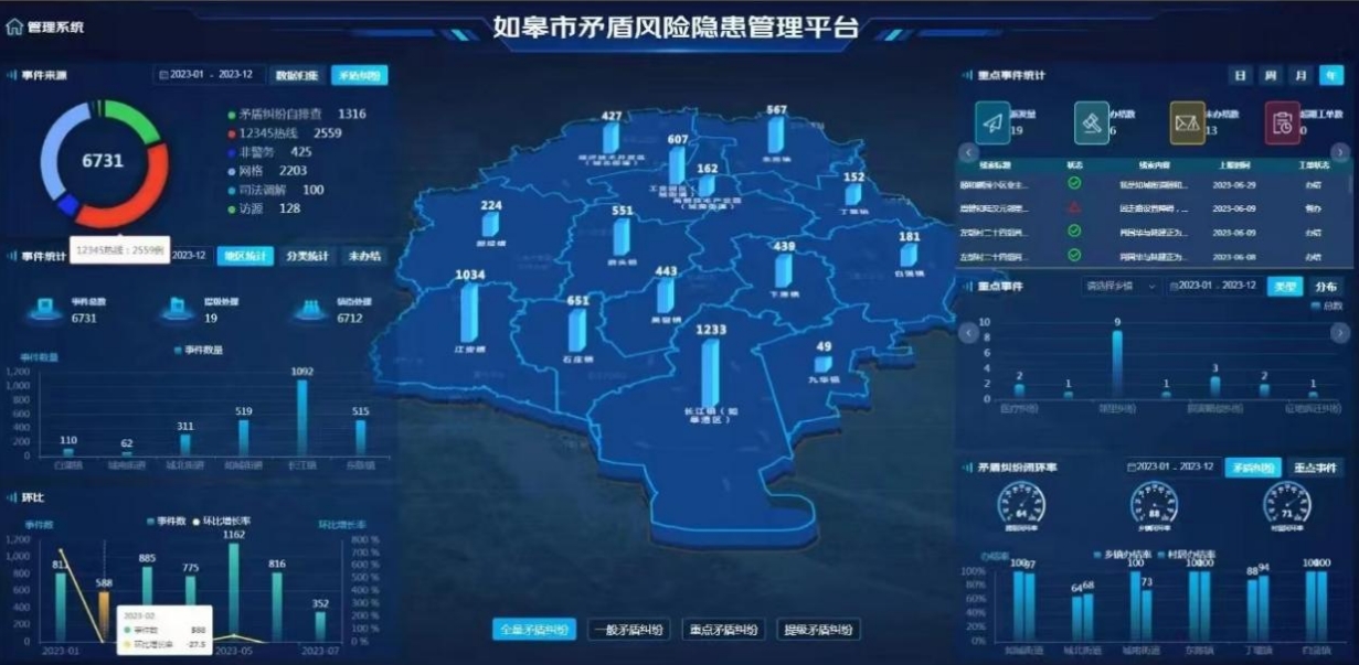 矛盾风险隐患管理平台打通与省司法行政系统、市委政法委网格化平台、市公安局接处警平台、政务数据共享交换平台的接口,承担矛盾纠纷一图展示、六类数据全量归集、矛盾线索分析研判、涉稳事件应急联动、纠纷事件闭环处置等五大核心功能,是矛盾纠纷排查管控、研判处置的“中枢大脑”。今年以来,平台归集镇(区、街道)、部门推送各类数据线索92751条,预警提示潜在矛盾纠纷11508件,市级提级办理复杂矛盾纠纷39件,化解24件。