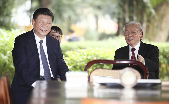 2017年11月13日,中共中央总书记、国家主席习近平在河内胡志明故居和越共中央总书记阮富仲交流。