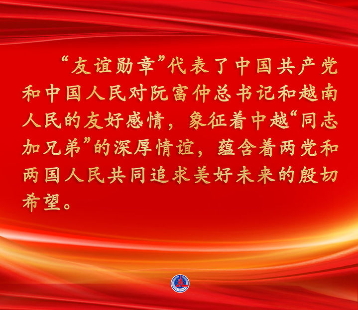 2022年10月31日,中共中央总书记、国家主席习近平在北京人民大会堂向越共中央总书记阮富仲授予中华人民共和国“友谊勋章”,并举行隆重颁授仪式。